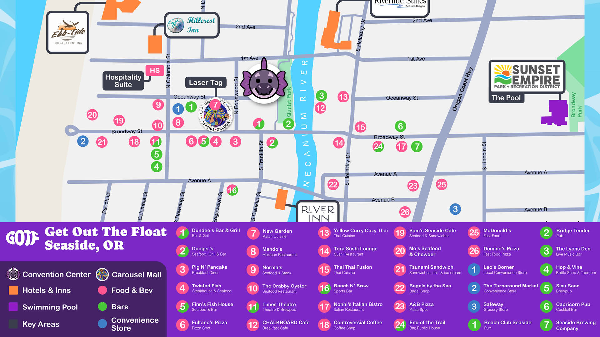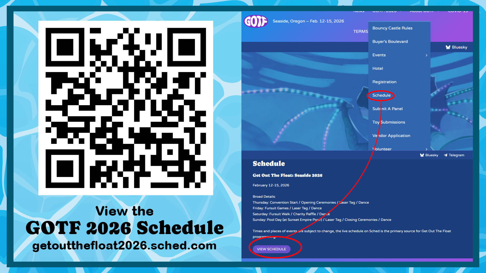 Times and places of events are subject to change, the live schedule on Sched is the primary source for Get Out The Float programming.